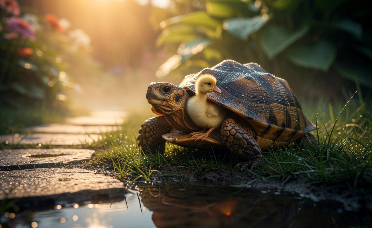 Es gibt Momente, die uns innehalten lassen. Ein stiller Garten, späte Sonne, der Duft nasser Erde – und mittendrin eine Begegnung, die Erwartungen umstößt. Eine gemächliche Schildkröte, seit Jahren vertraut mit Beeten und Steinen, lässt ein zart piepsendes Entenküken in ihre Nähe. Kein Fauchen, kein Rückzug. Stattdessen ein freundliches Aufeinandertreffen, das wie ein kleines Wunder wirkt. Ein Reptil schützt ein Küken – wider die Routine des Alltags. Solche Bilder brennen sich ein, weil sie zu Herzen gehen. Sie stellen Fragen, ohne laut zu werden, und zeigen, wie überraschend friedlich Natur sein kann.